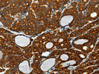The image on the left is immunohistochemistry of paraffin-embedded Human thyroid cancer tissue using CSB-PA830765(SELM Antibody) at dilution 1/25, on the right is treated with fusion protein. (Original magnification: ×200)