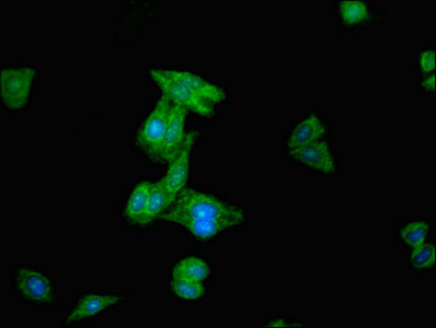 Immunofluorescent analysis of HepG2 cells using CSB-PA888026LA01HU at dilution of 1:100 and Alexa Fluor 488-congugated AffiniPure Goat Anti-Rabbit IgG(H+L)