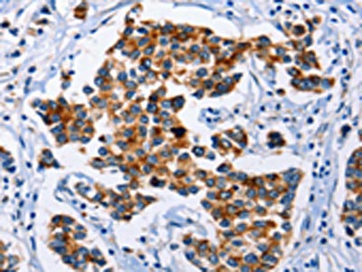 The image on the left is immunohistochemistry of paraffin-embedded Human breast cancer tissue using CSB-PA808693(SERPINA3 Antibody) at dilution 1/12, on the right is treated with synthetic peptide. (Original magnification: ×200)