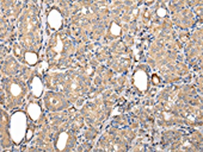 The image on the left is immunohistochemistry of paraffin-embedded Human thyroid cancer tissue using CSB-PA783838(SERPINA7 Antibody) at dilution 1/25, on the right is treated with fusion protein. (Original magnification: ×200)