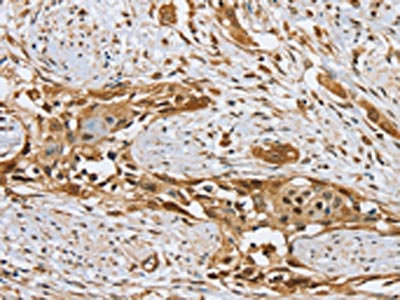 The image on the left is immunohistochemistry of paraffin-embedded Human esophagus cancer tissue using CSB-PA100535(SEZ6L Antibody) at dilution 1/35, on the right is treated with synthetic peptide. (Original magnification: ×200)