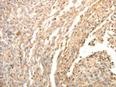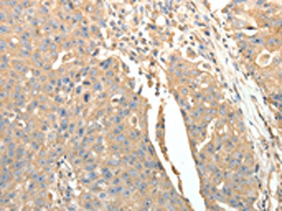 The image on the left is immunohistochemistry of paraffin-embedded Human cervical cancer tissue using CSB-PA820032(SFTPD Antibody) at dilution 1/30, on the right is treated with fusion protein. (Original magnification: ×200)
