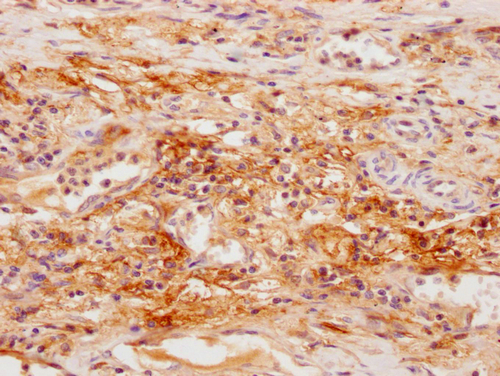 IHC image of CSB-PA021175NA01HU diluted at 1:100 and staining in paraffin-embedded human lung cancer performed on a Leica BondTM system. After dewaxing and hydration, antigen retrieval was mediated by high pressure in a citrate buffer (pH 6.0). Section was blocked with 10% normal goat serum 30min at RT. Then primary antibody (1% BSA) was incubated at 4°C overnight. The primary is detected by a Goat anti-rabbit polymer IgG labeled by HRP and visualized using 0.05% DAB.