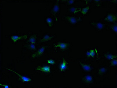 Immunofluorescent analysis of U251 cells using CSB-PA853470LA01HU at dilution of 1:100 and Alexa Fluor 488-congugated AffiniPure Goat Anti-Rabbit IgG(H+L)