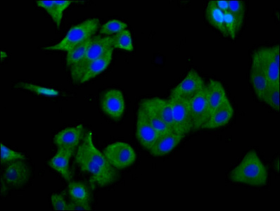 Immunofluorescence staining of HepG2 cells with CSB-PA618771LA01HU at 1:166, counter-stained with DAPI. The cells were fixed in 4% formaldehyde, permeabilized using 0.2% Triton X-100 and blocked in 10% normal Goat Serum. The cells were then incubated with the antibody overnight at 4°C. The secondary antibody was Alexa Fluor 488-congugated AffiniPure Goat Anti-Rabbit IgG(H+L).