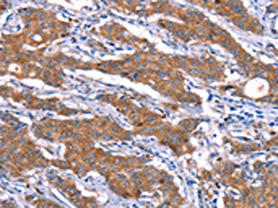 The image on the left is immunohistochemistry of paraffin-embedded Human gastic cancer tissue using CSB-PA915546(SGK2 Antibody) at dilution 1/15, on the right is treated with synthetic peptide. (Original magnification: ×200)