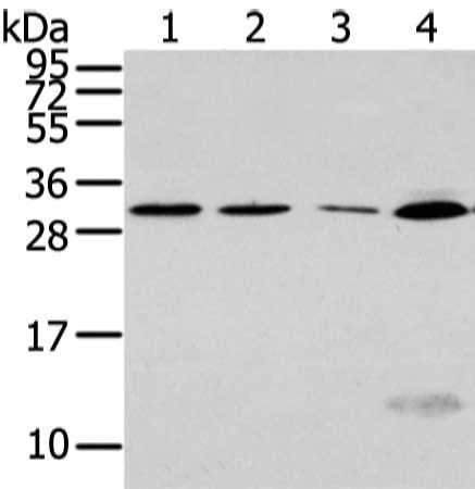 Gel: 12%SDS-PAGE, Lysate: 40 μg, Lane 1-4: Hela, Jurkat and hepg2 cell, human fetal liver tissue, Primary antibody: CSB-PA490759(SIAH1 Antibody) at dilution 1/300 dilution, Secondary antibody: Goat anti rabbit IgG at 1/8000 dilution, Exposure time: 1 minute