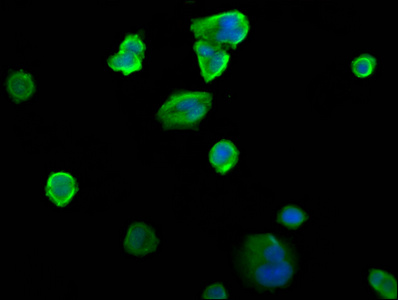 Immunofluorescence staining of MCF-7 cells with CSB-PA021288LA01HU at 1:200, counter-stained with DAPI. The cells were fixed in 4% formaldehyde, permeabilized using 0.2% Triton X-100 and blocked in 10% normal Goat Serum. The cells were then incubated with the antibody overnight at 4°C. The secondary antibody was Alexa Fluor 488-congugated AffiniPure Goat Anti-Rabbit IgG(H+L).