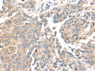 The image on the left is immunohistochemistry of paraffin-embedded Human lung cancer tissue using CSB-PA094289(SIRT4 Antibody) at dilution 1/35, on the right is treated with synthetic peptide. (Original magnification: ×200)