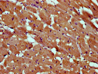 IHC image of CSB-PA823890LA01HU diluted at 1:400 and staining in paraffin-embedded human heart tissue performed on a Leica BondTM system. After dewaxing and hydration, antigen retrieval was mediated by high pressure in a citrate buffer (pH 6.0). Section was blocked with 10% normal goat serum 30min at RT. Then primary antibody (1% BSA) was incubated at 4°C overnight. The primary is detected by a biotinylated secondary antibody and visualized using an HRP conjugated SP system.