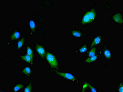 Immunofluorescent analysis of Hela cells using CSB-PA613387LA01HU at dilution of 1:100 and Alexa Fluor 488-congugated AffiniPure Goat Anti-Rabbit IgG(H+L)