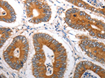 The image on the left is immunohistochemistry of paraffin-embedded Human colon cancer tissue using CSB-PA539726(SLC12A6 Antibody) at dilution 1/40, on the right is treated with synthetic peptide. (Original magnification: ×200)