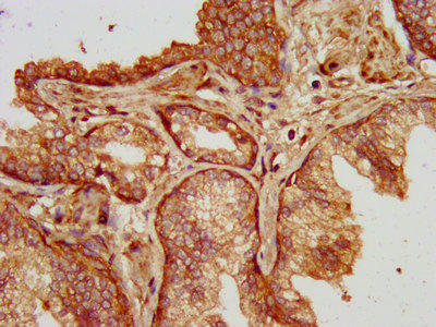 IHC image of CSB-PA615678LA01HU diluted at 1:200 and staining in paraffin-embedded human prostate cancer performed on a Leica BondTM system. After dewaxing and hydration, antigen retrieval was mediated by high pressure in a citrate buffer (pH 6.0). Section was blocked with 10% normal goat serum 30min at RT. Then primary antibody (1% BSA) was incubated at 4°C overnight. The primary is detected by a biotinylated secondary antibody and visualized using an HRP conjugated SP system.