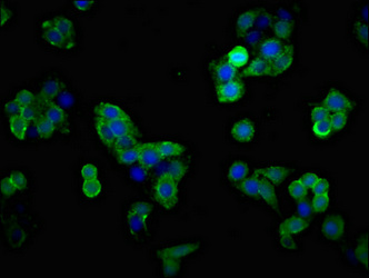 Immunofluorescent analysis of PC-3 cells using CSB-PA021433LA01HU at dilution of 1:100 and Alexa Fluor 488-congugated AffiniPure Goat Anti-Rabbit IgG(H+L)