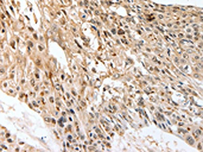 The image on the left is immunohistochemistry of paraffin-embedded Human esophagus cancer tissue using CSB-PA067798(SLC1A7 Antibody) at dilution 1/60, on the right is treated with synthetic peptide. (Original magnification: ×200)