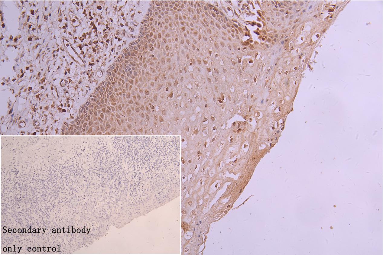 IHC image of CSB-PA823881LA01HU diluted at 1:300 and staining in paraffin-embedded human cervical cancer performed on a Leica BondTM system. After dewaxing and hydration, antigen retrieval was mediated by high pressure in a citrate buffer (pH 6.0). Section was blocked with 10% normal goat serum 30min at RT. Then primary antibody (1% BSA) was incubated at 4°C overnight. The primary is detected by a Goat anti-rabbit polymer IgG labeled by HRP and visualized using 0.05% DAB.