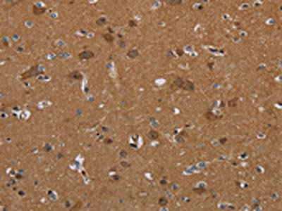 The image on the left is immunohistochemistry of paraffin-embedded Human brain tissue using CSB-PA917054(SLC22A2 Antibody) at dilution 1/30, on the right is treated with synthetic peptide. (Original magnification: ×200)