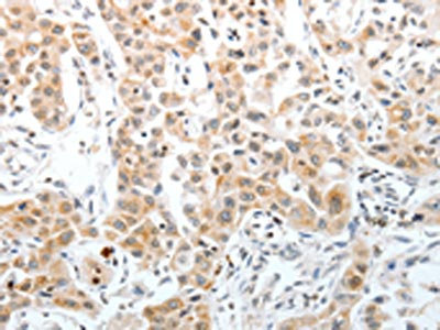 The image on the left is immunohistochemistry of paraffin-embedded Human liver cancer tissue using CSB-PA565630(SLC22A3 Antibody) at dilution 1/40, on the right is treated with synthetic peptide. (Original magnification: ×200)