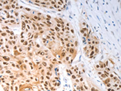The image on the left is immunohistochemistry of paraffin-embedded Human esophagus cancer tissue using CSB-PA967057(SLC22A8 Antibody) at dilution 1/70, on the right is treated with synthetic peptide. (Original magnification: ×200)