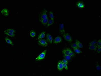 Immunofluorescent analysis of HepG2 cells using CSB-PA874800LA01HU at dilution of 1:100 and Alexa Fluor 488-congugated AffiniPure Goat Anti-Rabbit IgG(H+L)