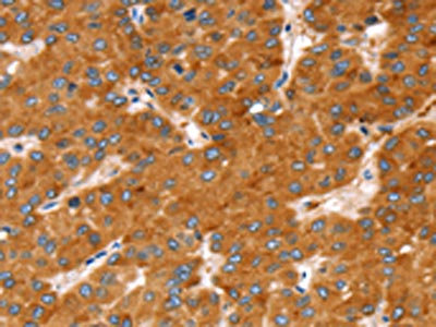 The image on the left is immunohistochemistry of paraffin-embedded Human liver cancer tissue using CSB-PA577196(SLC27A2 Antibody) at dilution 1/20, on the right is treated with fusion protein. (Original magnification: ×200)