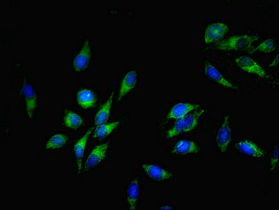 Immunofluorescent analysis of Hela cells using CSB-PA843146LA01HU at dilution of 1:100 and Alexa Fluor 488-congugated AffiniPure Goat Anti-Rabbit IgG(H+L)