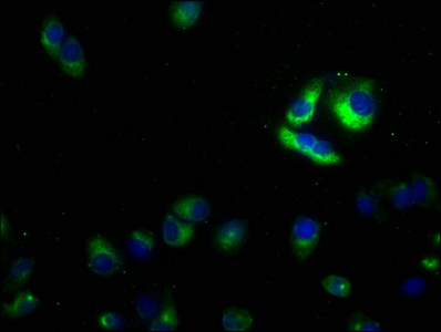 Immunofluorescence staining of Hela cells with CSB-PA891736LA01HU at 1:50, counter-stained with DAPI. The cells were fixed in 4% formaldehyde, permeabilized using 0.2% Triton X-100 and blocked in 10% normal Goat Serum. The cells were then incubated with the antibody overnight at 4°C. The secondary antibody was Alexa Fluor 488-congugated AffiniPure Goat Anti-Rabbit IgG(H+L).
