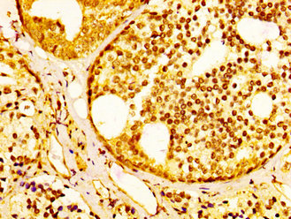 IHC image of CSB-PA836239LA01HU diluted at 1:300 and staining in paraffin-embedded human prostate cancer performed on a Leica BondTM system. After dewaxing and hydration, antigen retrieval was mediated by high pressure in a citrate buffer (pH 6.0). Section was blocked with 10% normal goat serum 30min at RT. Then primary antibody (1% BSA) was incubated at 4°C overnight. The primary is detected by a biotinylated secondary antibody and visualized using an HRP conjugated SP system.