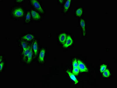 Immunofluorescent analysis of HepG2 cells using CSB-PA773784LA01HU at dilution of 1:100 and Alexa Fluor 488-congugated AffiniPure Goat Anti-Rabbit IgG(H+L)