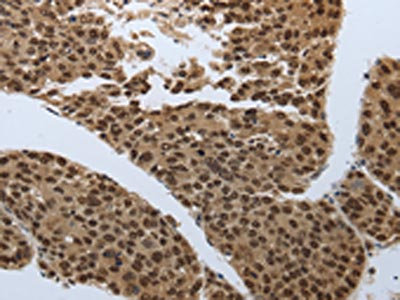 The image on the left is immunohistochemistry of paraffin-embedded Human liver cancer tissue using CSB-PA950035(SMAD7 Antibody) at dilution 1/60, on the right is treated with synthetic peptide. (Original magnification: ×200)