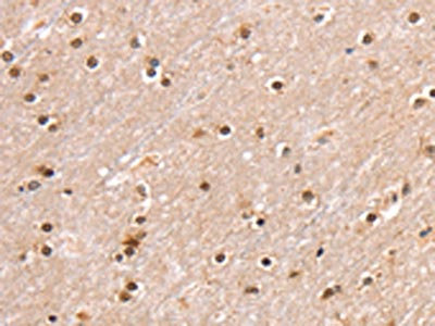 The image on the left is immunohistochemistry of paraffin-embedded Human brain tissue using CSB-PA062373(SMARCB1 Antibody) at dilution 1/30, on the right is treated with fusion protein. (Original magnification: ×200)