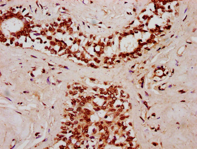IHC image of CSB-PA854104LA01HU diluted at 1:400 and staining in paraffin-embedded human breast cancer performed on a Leica BondTM system. After dewaxing and hydration, antigen retrieval was mediated by high pressure in a citrate buffer (pH 6.0). Section was blocked with 10% normal goat serum 30min at RT. Then primary antibody (1% BSA) was incubated at 4°C overnight. The primary is detected by a biotinylated secondary antibody and visualized using an HRP conjugated SP system.