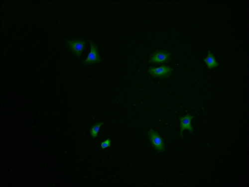 Immunofluorescence staining of A549 cells with CSB-PA774793LA01HU-IF at 1:100, counter-stained with DAPI. The cells were fixed in 4% formaldehyde and blocked in 10% normal Goat Serum. The cells were then incubated with the antibody overnight at 4°C. The secondary antibody was Alexa Fluor 488-congugated AffiniPure Goat Anti-Rabbit IgG(H+L).