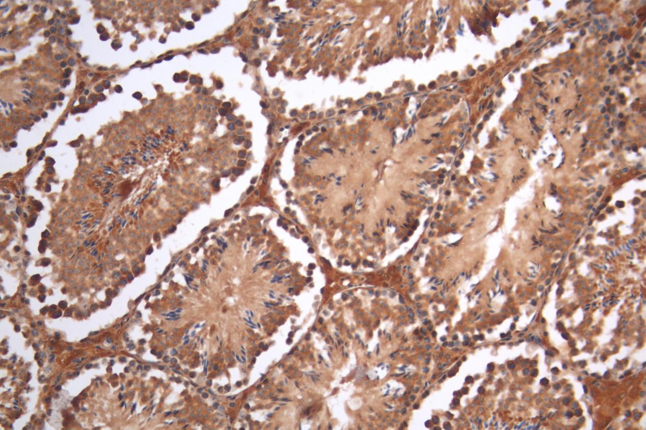 IHC image of CSB-PA875673LA01HU diluted at 1:200 and staining in paraffin-embedded human testis tissue performed on a Leica BondTM system. After dewaxing and hydration, antigen retrieval was mediated by high pressure in a citrate buffer (pH 6.0). Section was blocked with 10% normal goat serum 30min at RT. Then primary antibody (1% BSA) was incubated at 4°C overnight. The primary is detected by a Goat anti-rabbit polymer IgG labeled by HRP and visualized using 0.05% DAB.