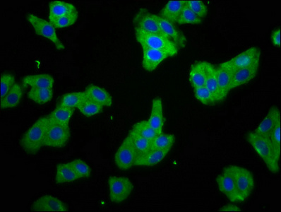 Immunofluorescence staining of HepG2 cells with CSB-PA021846LA01HU at 1:66, counter-stained with DAPI. The cells were fixed in 4% formaldehyde, permeabilized using 0.2% Triton X-100 and blocked in 10% normal Goat Serum. The cells were then incubated with the antibody overnight at 4°C. The secondary antibody was Alexa Fluor 488-congugated AffiniPure Goat Anti-Rabbit IgG(H+L).