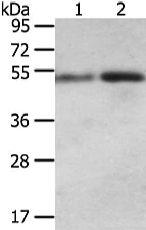 Gel: 8%SDS-PAGE, Lysate: 80 μg, Lane 1-2: Human colon cancer and normal stomach tissue, Primary antibody: CSB-PA289378(SNTA1 Antibody) at dilution 1/200 dilution, Secondary antibody: Goat anti rabbit IgG at 1/8000 dilution, Exposure time: 1 minute