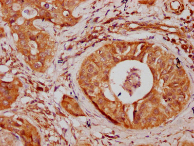 IHC image of CSB-PA896538LA01HU diluted at 1:300 and staining in paraffin-embedded human cervical cancer performed on a Leica BondTM system. After dewaxing and hydration, antigen retrieval was mediated by high pressure in a citrate buffer (pH 6.0). Section was blocked with 10% normal goat serum 30min at RT. Then primary antibody (1% BSA) was incubated at 4°C overnight. The primary is detected by a biotinylated secondary antibody and visualized using an HRP conjugated SP system.