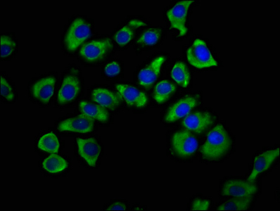 Immunofluorescence staining of A549 cells with CSB-PA891787LA01HU at 1:200, counter-stained with DAPI. The cells were fixed in 4% formaldehyde, permeabilized using 0.2% Triton X-100 and blocked in 10% normal Goat Serum. The cells were then incubated with the antibody overnight at 4°C. The secondary antibody was Alexa Fluor 488-congugated AffiniPure Goat Anti-Rabbit IgG(H+L).