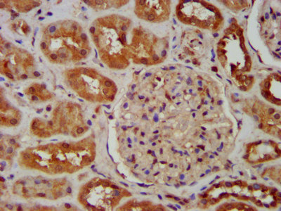 IHC image of CSB-PA891787LA01HU diluted at 1:600 and staining in paraffin-embedded human kidney tissue performed on a Leica BondTM system. After dewaxing and hydration, antigen retrieval was mediated by high pressure in a citrate buffer (pH 6.0). Section was blocked with 10% normal goat serum 30min at RT. Then primary antibody (1% BSA) was incubated at 4°C overnight. The primary is detected by a biotinylated secondary antibody and visualized using an HRP conjugated SP system.
