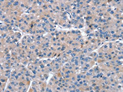 The image on the left is immunohistochemistry of paraffin-embedded Human liver cancer tissue using CSB-PA973524(SNX27 Antibody) at dilution 1/20, on the right is treated with fusion protein. (Original magnification: ×200)
