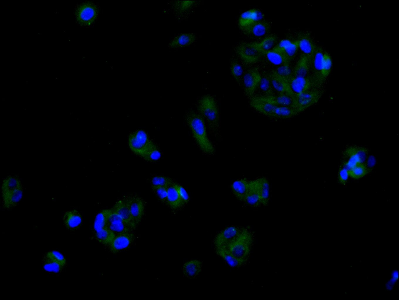 Immunofluorescence staining of HepG2 cell with 5% goat serum, counter-stained with DAPI. The cells were fixed in 4% formaldehyde and blocked in 10% normal Goat Serum. The cells were then incubated with the antibody overnight at 4C. The secondary antibody was Alexa Fluor 488-congugated AffiniPure Goat Anti-Rabbit IgG(H+L).