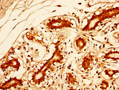 IHC image of CSB-PA16539A0Rb diluted at 1:500 and staining in paraffin-embedded human breast cancer performed on a Leica BondTM system. After dewaxing and hydration, antigen retrieval was mediated by high pressure in a citrate buffer (pH 6.0). Section was blocked with 10% normal goat serum 30min at RT. Then primary antibody (1% BSA) was incubated at 4°C overnight. The primary is detected by a biotinylated secondary antibody and visualized using an HRP conjugated SP system.