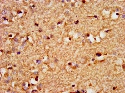 IHC image of CSB-PA022429LA01HU diluted at 1:300 and staining in paraffin-embedded human brain tissue performed on a Leica BondTM system. After dewaxing and hydration, antigen retrieval was mediated by high pressure in a citrate buffer (pH 6.0). Section was blocked with 10% normal goat serum 30min at RT. Then primary antibody (1% BSA) was incubated at 4°C overnight. The primary is detected by a biotinylated secondary antibody and visualized using an HRP conjugated SP system.
