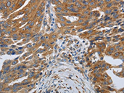 The image on the left is immunohistochemistry of paraffin-embedded Human lung cancer tissue using CSB-PA090256(SPAG1 Antibody) at dilution 1/25, on the right is treated with synthetic peptide. (Original magnification: ×200)