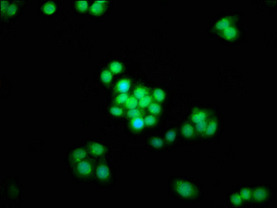 Immunofluorescence staining of PC-3 cells with CSB-PA858730LA01HU at 1:133, counter-stained with DAPI. The cells were fixed in 4% formaldehyde, permeabilized using 0.2% Triton X-100 and blocked in 10% normal Goat Serum. The cells were then incubated with the antibody overnight at 4°C. The secondary antibody was Alexa Fluor 488-congugated AffiniPure Goat Anti-Rabbit IgG(H+L).
