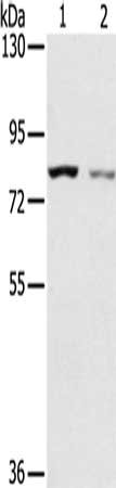Gel: 6%SDS-PAGE, Lysate: 40 μg, Lane 1-2: A549 cells, A172 cells, Primary antibody: CSB-PA960717(SPATA5L1 Antibody) at dilution 1/200, Secondary antibody: Goat anti rabbit IgG at 1/8000 dilution, Exposure time: 2 minutes