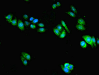 Immunofluorescent analysis of HepG2 cells using CSB-PA022675LA01HU at dilution of 1:100 and Alexa Fluor 488-congugated AffiniPure Goat Anti-Rabbit IgG(H+L)