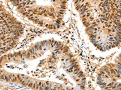 The image on the left is immunohistochemistry of paraffin-embedded Human colon cancer tissue using CSB-PA924119(SSB Antibody) at dilution 1/50, on the right is treated with synthetic peptide. (Original magnification: ×200)