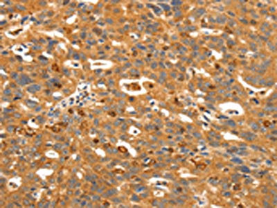 The image on the left is immunohistochemistry of paraffin-embedded Human liver cancer tissue using CSB-PA597067(SSTR3 Antibody) at dilution 1/30, on the right is treated with synthetic peptide. (Original magnification: ×200)