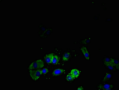Immunofluorescent analysis of HepG2 cells using CSB-PA022727ESR1HU at dilution of 1:100 and Alexa Fluor 488-congugated AffiniPure Goat Anti-Rabbit IgG(H+L)